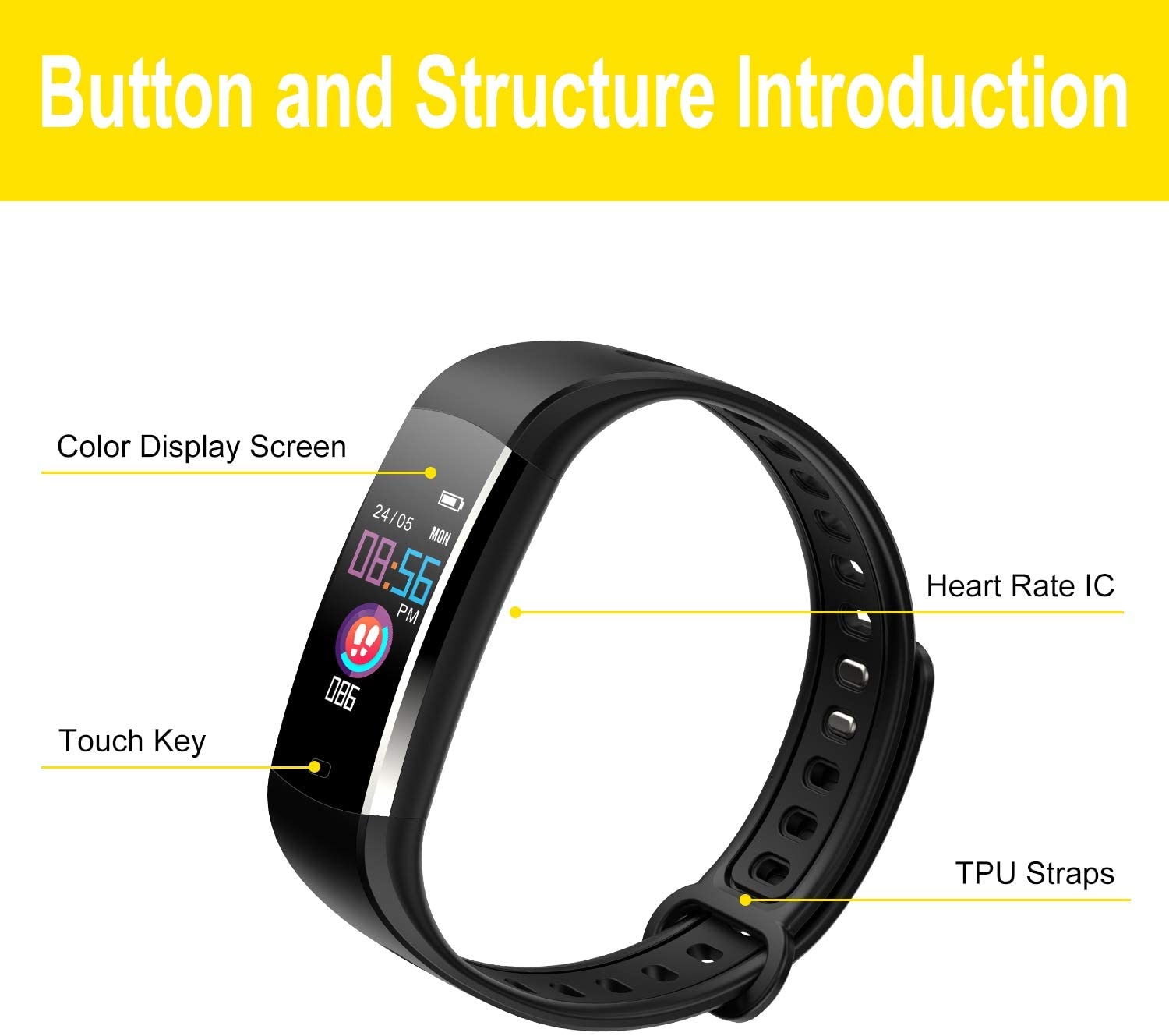 | Supported Application | Fitness Tracker, Time Display, Sleep Monitor, Alarm, Pedometer, Camera, Heart Rate Monitor |